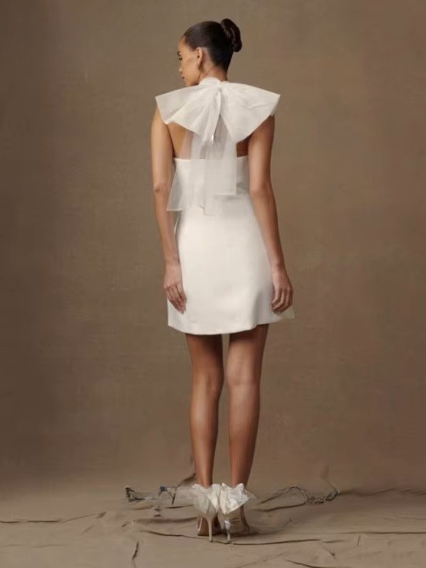 Simple Mini Mermaid Satin Wedding Dress Sexy Sleeveless Tulle Hatler Formal Pleat Open Back with Bow Boho Short Grown Customized